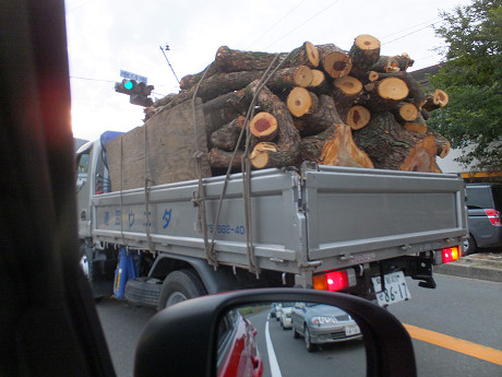 京都に来たので、高校の修学旅行の時に行った嵐山をレンタカーを借りて再び訪問。当時、間違えなく歩いたはずなのに、実際にどこを歩いたのかは全く記憶になかった・・・。 桂川にかかる渡月橋の交差点で信号待ちをしていたら右折レーンに伐採した木を満載しているトラックが通りかかったので、速攻でシャッターを切った。 「「日本全国、どこに行っても薪の原木はあるなぁ」と改めて思った。