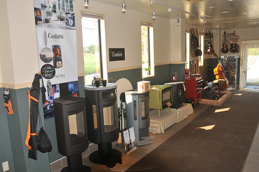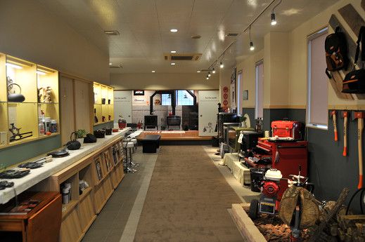 広い店内には薪ストーブはもちろん、薪割り機やダッチオーブン、アクセサリー類も充実のラインナップ