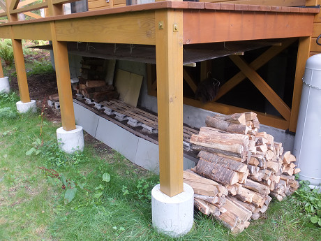 ウッドデッキの下に波板を吊るした屋根の薪棚。そこに針金で結束された薪が若干残っていた。とりあえず、それを横にどかして、配達した薪を井桁で積んで、手前の出しやすい方に前からあった薪を乗せておいた。