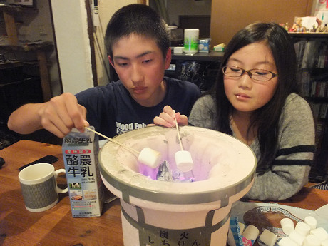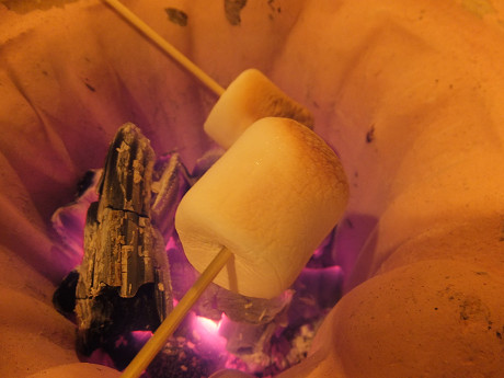 薪ストーブをガンガン焚くと、熾き火ができる。この熾き火を活用して炉内で色々料理もできるけど、簡単なオヤツのマシュマロ焼きも楽しい。子供に大人気の定番だ。やわらかくて、ふわふわトロトロで、そのまま食べるより何倍も美味しくなる。
