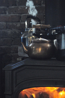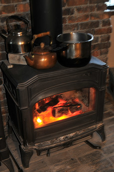 焚付けと同時に天板の上でお湯を沸かす