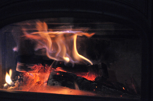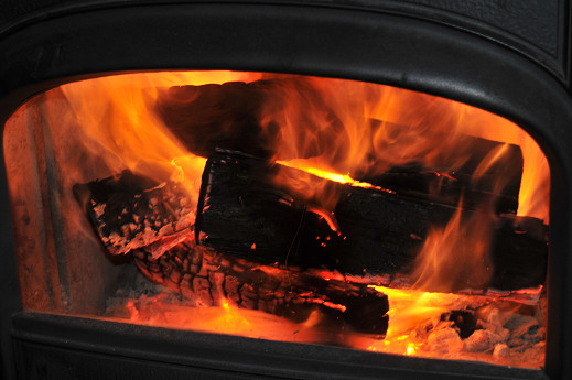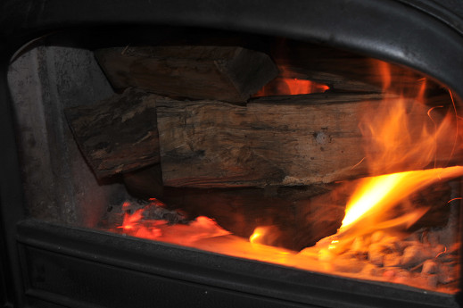 朝起きて、熾き火がそれなりに残っていたので、強引に太い薪を目一杯突っ込む