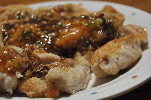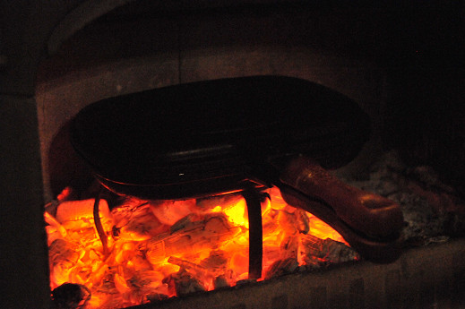 ハッピーコールを使うと、ごくごく少量(5ミリくらいの深さ)の油だけで揚げ物ができる。熾き火になった薪ストーブの炉内でチキン竜田を作ってみた。