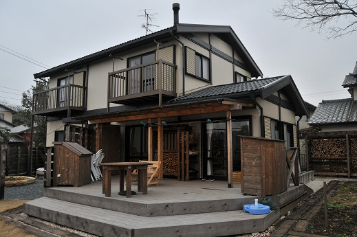 広いウッドデッキは、腐食したら交換して、その後は燃やすために、あえて無塗装のヒノキ製
