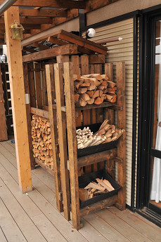 掃き出し窓の外には直近の数日分の薪が保管できるように棚がある。先日の大雪の際にも重宝したとのこと。