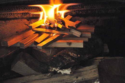 GWラストの二日間は天候もイマイチで肌寒かった。着込めば薪ストーブがなくても何とか過ごせるけど、焚いた方が快適なので、火を入れた。二日目は前日とは違う、上から着火方式にした。バーナーにも着火材にも頼らず、マッチ一本でキメてみた。