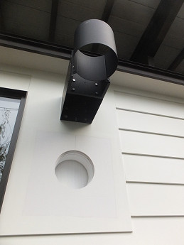 このお家では、煙突を壁出しして、そのままベランダを貫通させるプランだけど、ベランダの通行の邪魔にならず、なおかつ二階の屋根の軒先に干渉しない絶妙な位置に通したのがポイントだ。通常よりも壁面から離れたところを煙突が立ち上がるので、壁面のサポート部材には京阪エンジニアリングのものを採用した。これはデザインも美しく、使い勝手も良く、設置工事も比較的簡単に行える優れものなのだ。