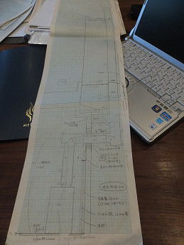 このように方眼紙を継ぎ足して、正確な縮尺で図面を作成して間違えのないように丁寧に図面を作成されていた。私が現場調査する時には、ここまで丁寧な図面は作成しないでポイントとなる寸法だけメモ書きで済ませてしまうけれども、慣れない人が初めてやる時にはこのくらい慎重にやるのが良いと思った。