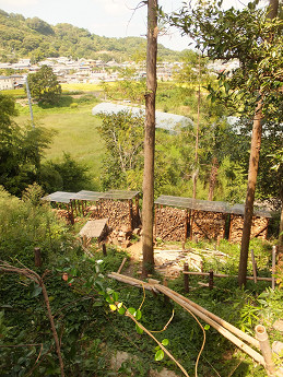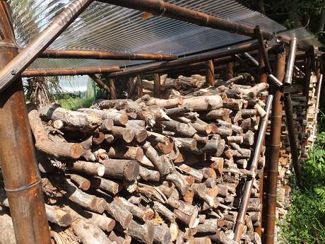 薪棚も竹を利用して組み合わせて作ってポリカの屋根をかけて低予算で合理的な造りだった。