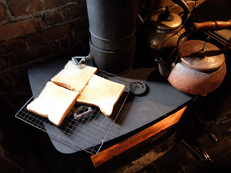 火を入れてすぐに感じることだけど、鋼鈑製のハンターは熱の伝わり方が鋳物製の薪ストーブとは比較にならないほど早い。暖かさをすぐに実感することができる。焚きつけ後30分後には天板のヤカンのお湯がボコボコ沸騰している。焚きつけ後30分後に家を出るために、その途中に天板でトーストを焼き、沸かしたお湯でコーヒーを飲むことができる。