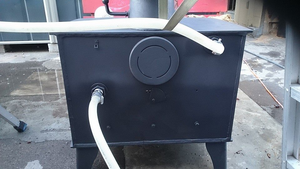 このように炉内のバッフルの位置に設定したタンクをガンガン焚いて、初めてまともな給湯の熱源として使えるようになるのだ。ちなみに給湯システムとしてバッフルとタンクを入れ替えて使った場合に、単純な薪ストーブとして室内に発生される熱の6割は給湯に持っていかれてしまう。薪ストーブとしての出力は、このシステムを使った場合は4割程度になる。