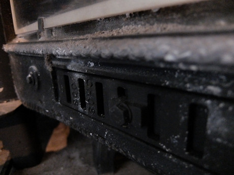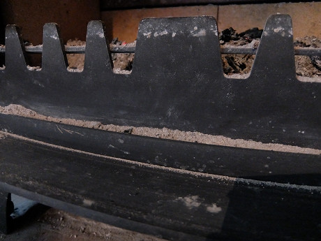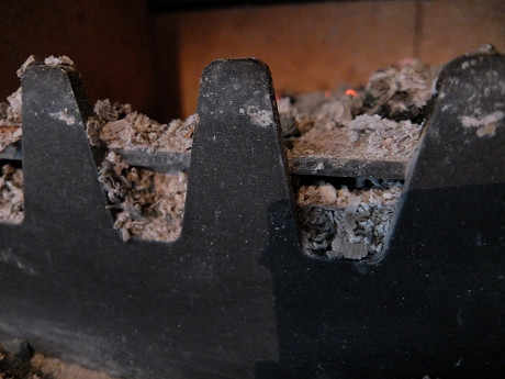 扉についているガスケットとアイアンダインを良く観察すると判ることだけど、一次燃焼用の空気の取り入れスリットの上部にガスケットがあり、それがアイアンダインの上部に接するようになっている。つまり、アイアンダインの谷の部分まで灰が溜まってしまうと正常に一次燃焼の空気が炉内に入ってこなくなる。