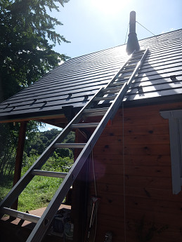 そこで煙突トップにアクセスする際には、二連梯子をかけるのが一般的だ。緩い勾配の屋根であれば雨どい部分に二連梯子をかけてそこから屋根に上って、歩いていけば良い。