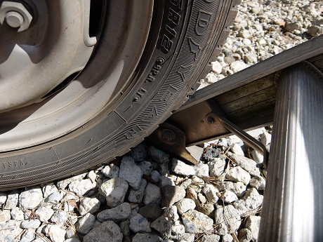 今回の現場は車が入れる状況だったので、タイヤで二連梯子の足元をがっちり受けた。これにより何の不安もなく梯子を登っていくことができた。