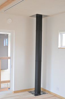二階のコーナー部分の邪魔にならないところを煙突が立ち上がる
