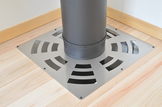 もう一枚スリット化粧板は予備で持って行っていたので、この一階の天井部分を、二階の床部分と同様にふさいでしまうのもアリなのだけど、そうすると貫通部分内部の掃除が困難になること、子供がミニカーなどの玩具をスリットから落とした際に回収困難になるので、下側はふさがない方が合理的だと判断して、敢えてつけなかった。(そのまま炉台に落下してしまった方が良いという判断)