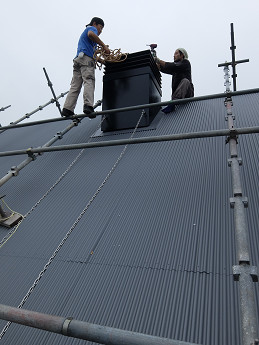 先日、工務店とチムニー制作の現場打ち合わせをして、いよいよチムニーが完成したという連絡を受けた。屋根足場が撤去されてしまうと、煙突工事が、不可能になってしまうので、足場の解体の日程を確認して、その前に煙突工事を行った。