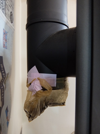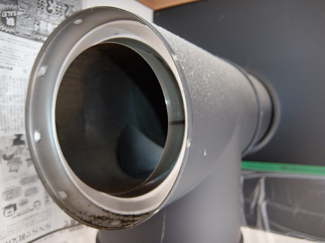 壁抜きの室内側の折れ曲がり部分にメンテナンス用の蓋がないとブラシが通らないので、煙突掃除の際に煙突を分解して、屋外に持ち出して掃除する必要がある。これはけっこうな手間で、正直言うと、気が重くなる、おっくうな作業だ。バラすと必ず内部に堆積した大量の煤が飛び散るし、そもそもバラすこと自体が面倒だし、屋外での作業の時には、煙突表面を傷つけたり汚したりするリスクもそれなりにあるからだ。