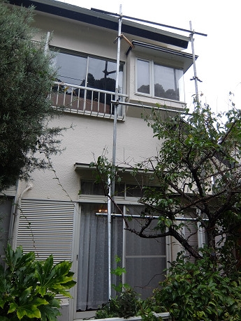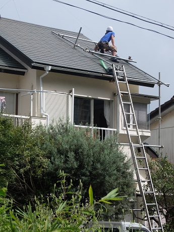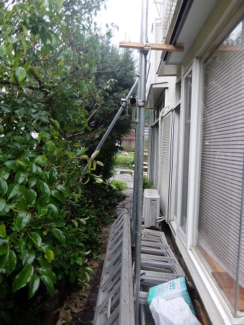 6寸の急勾配の屋根なので、足場なしで歩くのは厳しい。ましてチムニー作成工事や煙突工事をするわけなので、どうしても足場が必要になる。 まずは壁面部分を組んでいく 転倒しないように控えを取る 引き続き、屋根の部分の足場へと進んでいく。