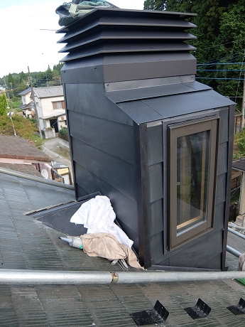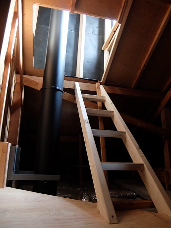 チムニーを大きく作って開閉可能な窓をつけて、小屋裏から直接屋根に出られるようにした。滑りやすいコロニアルの屋根は雨仕舞いのために剥がした際に雪止め金具をきちんと釘で野地板に固定して、足場として安全に登っていけるようにした。転落の危険がないようにチムニーの上側に身体を預けて、安心して煙突掃除できる。