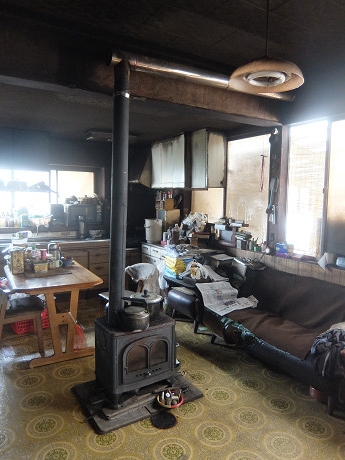 煙が室内側にモクモク出てきてしまうのが見ただけで判る設置状況だった。お客さんは「薪ストーブを壁際に寄せて横引きを短くすればいいんじゃないの?」って軽く考えていたようだけど、実際には横引きの後の屋外の縦の立ち上げを3倍以上にしないとならないし、そうすると支柱を立てたりと大掛かりな工事になる。さらに煙突トップへのアクセスが極めて困難で実用的ではない。「根本的に解決するには屋根をぶち抜いて煙突を真っすぐ立ち上げるしかない」ということで提案してきた。