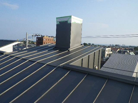 煙突貫通部分にはケイカル板も打ち付けて準備完了。ここから国産の高木工業所の二重断熱煙突が降りてくる。