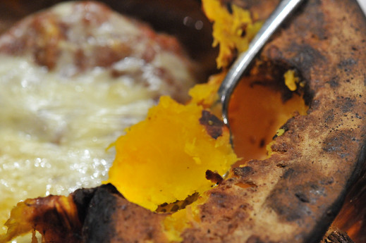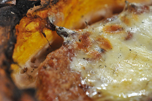 種の部分をスプーンでくり抜いて、潮、コショー、香辛料と混ぜたひき肉を詰め込み、最後はチーズで仕上げ