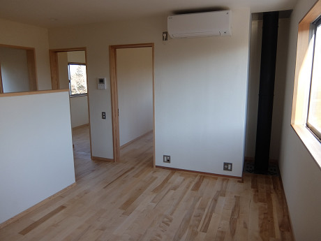 煙突だけのためのスペースを有効利用して、二階に一階の暖気を上げて効率良く全館暖房する