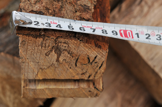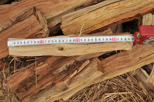 作成する薪のサイズについては【長さ33-35センチ、断面の太さ8センチ程度の正方形に近い形状】の規格でいく。それより細い枝も、曲がっているもの以外は極力割って、乾燥重視の良い薪を作る予定だ。参加者が自分の思い思いのサイズや形状で作ると収拾がつかなくなってしまうからだ。