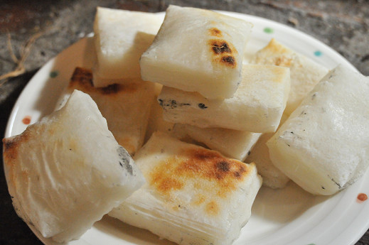 ついたお餅は特に大好物。 お雑煮、磯辺薪、きなこ餅 お餅大好き。 見てないうちにスグ焦げてしまい 勿体ないので焼網に乗せてジックリ天板のうえで膨らませてから磯辺巻! 熾きで最後だけ、 きつね色。