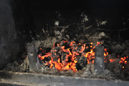 一晩焚いて、翌朝灰の中から熾火を掘り出した場合に、一般的な他の薪ストーブの場合には一次空気の調整を開いてやれば、勝手に熾火が元気になって再稼働も楽勝だけど、AGNIの場合にはそういう流れが発生しない。熾火を集めたら、火吹き竹、フイゴ、自転車の空気入れなどを使って熾火に空気を送って、熾火を元気に復活させると良い。
