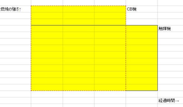 黒の実線の長方形の燃え方が触媒機