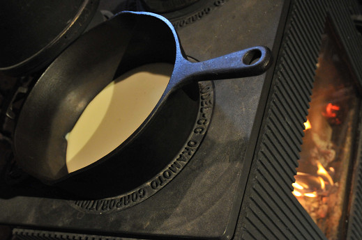天板にダッチオーブンを置いて、その中でチーズを溶かしてグツグツ沸騰気味になるまで、待つ。 あまり放置すると焦がしてしまうので注意 表面に膜が張って、内部がボコボコ沸騰したら完成 パンにつけて食べると美味しい ダッチオーブンだと長時間蓄熱してくれるので、天板から食卓に移動しても、チーズが溶けた食べごろを維持できる 薪ストーブシーズンが終わってしまうと、薪ストーブ料理が楽しめなくなるので、今のうちに名残惜しむように機会を作って、色々やっている。 ワインと相性が良い