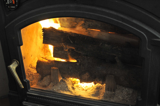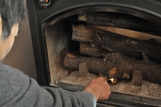なるほど。炎は、勢いよく薪の背後に回り込んでから立ち上がっていますね。そうすると、炉内で発煙していても、その分の多くが、空気の流れに乗って炉内に再循環されていそうですね。だとすると、発煙は少なそうです。