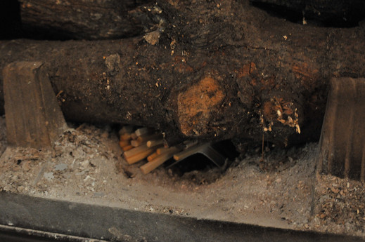 上に組んだ薪の中央部分がロケット焚付と同じことになりますので、あまり発煙しません。