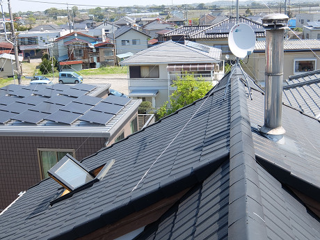 ログハウスの場合は勾配のきつい屋根となるケースが多い。その場合、煙突掃除で煙突トップへのアクセスが問題となる。よく「室内側から上へブラシを突けばOK」みたいな言い方で説明している人もいるけど、煙突の筒の中は掃除できても、一番煤の溜まるトップ(傘)の部分の煤は除去できないので、最終的には詰まってしまう。根本的には、屋根の上の登ってトップを取り外して掃除しないとダメなのだ。