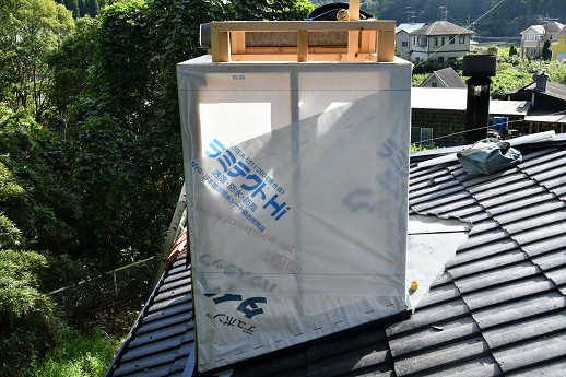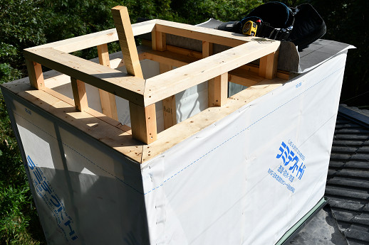 通常の角トップのサイズでそのままチムニーを立ち上げると、人が内部を出入りする時に狭くなってしまうので、一回り大きいサイズにして、角トップを取付ける部分だけ絞って突き出した形になっている。