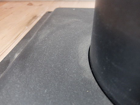 化粧版の入れ替え案件 2016/9/28(10年前) 薪ストーブ 4 一階の薪ストーブの暖気を二階にスムーズに上がるように、ノーマルの化粧板を「かわはら式スリット化粧板」に入れ替えたいという依頼があっったので、現場の確認に行ってきた。 現在使用中の状況 この化粧板を「かわはら式スリット化粧板」に変更したいということで呼ばれた 二階の煙突貫通部分 足元のこの凸型の化粧板も「かわはら式スリット化粧板」に入れ替え 黒塗装は、実際の使用時にこのように埃や汚れが目立つのでステンレスの無塗装をお勧めした