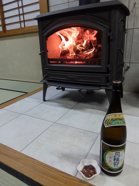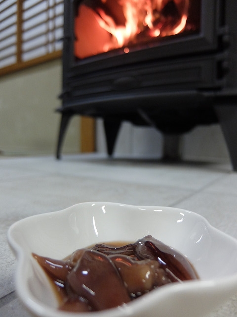 薪ストーブの炎と、京都の日本酒と、富山のホタルイカのコラボ