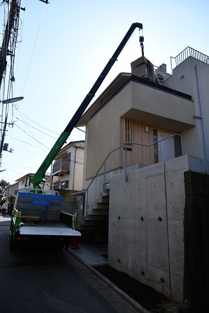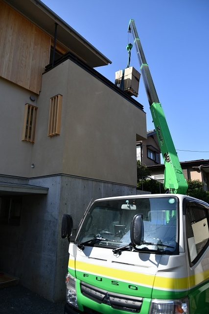 今回の、東京都内での薪ストーブ設置は3階リビングへの設置だった。階段は狭く折れ曲がっているので、そこを人力で薪ストーブを運び入れるのは、かなりリスクが高い。そこでクレーンで一気に吊り上げる作戦を取った。そのため、普通の薪ストーブにはできない「空を飛ぶ」という経験をした。