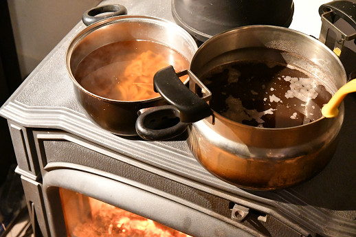 お節料理を作るのにも薪ストーブの天板が大活躍だ。 ドブレ700SLの天板で年越しそばの汁と、黒豆の煮物を同時に作った 長時間の煮込み料理に最適