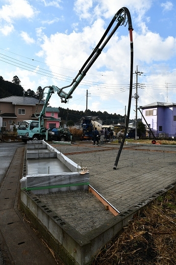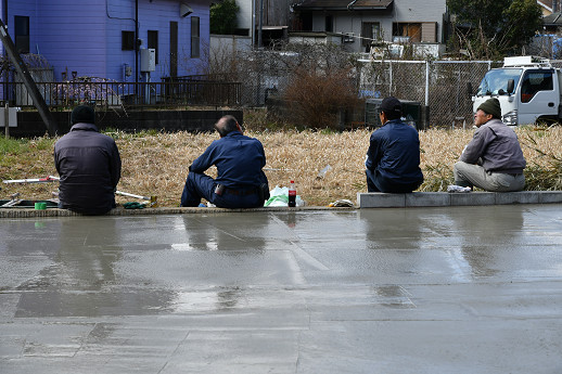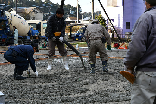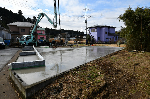 ポンプ車とコンクリートミキサー車が登場 とりあえずワイヤーメッシュを浮かしている その後で、コンクリートを打設 順調に進んだ お疲れ様でした 1週間して、コンクリートが硬化して強度が出たら、フォークリフトでも、この場所に入れるようになるけど、薪作りの作業の前に、次は「理想の薪小屋」の製作だ。敷地の端の基礎部分に小屋を建てる。