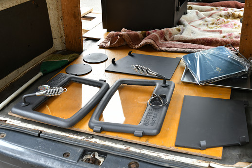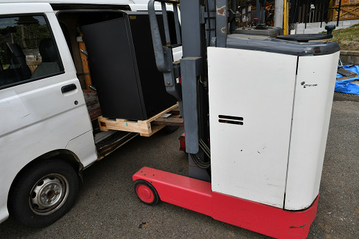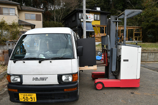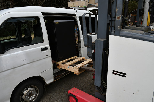 広い荷台のトラックや軽トラックならば、入荷した薪ストーブをパレットごと積み込んで、現場に到着して荷台で、開梱、パレットから降ろす段取りでも良いが、軽ワゴンだと、物理的に本体だけしか入らない。