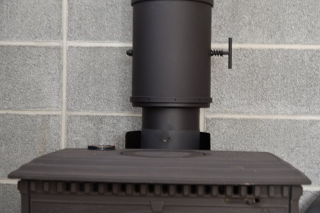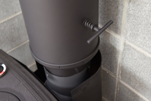 排気温度を下げずに強いドラフト(上昇気流)で安定燃焼させるために、シングル煙突から二重断熱煙突に入れ替えて、風圧帯の対策で煙突を2メートル延長したので、今回はこれまでついていなかったダンパーをつけた。