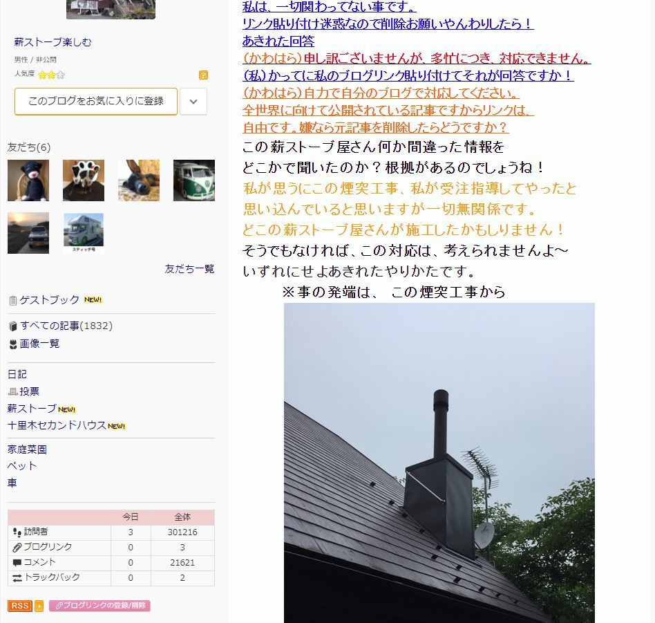 今後、私のブログの記事を見て薪ストーブ設置や煙突掃除、薪の配達などの仕事の依頼を考えているならば、私は見る人の立場次第では彼の言うように「悪質薪ストーブ屋」「悪徳薪ストーブ屋」「あきれた薪ストーブ屋」なので、十分に気をつけて欲しい。道理に合わないことはしないし、自分が納得のいかないことで圧力をかけても言いなりにはならないので「お客様は神様扱いで、なんでもかんでも自分の思い通りに無料で動かしてやろう(※)」とか「相見積もり取って1円でも安いところでやろう」と思っているならば、他店の門を叩いた方が良いだろう。