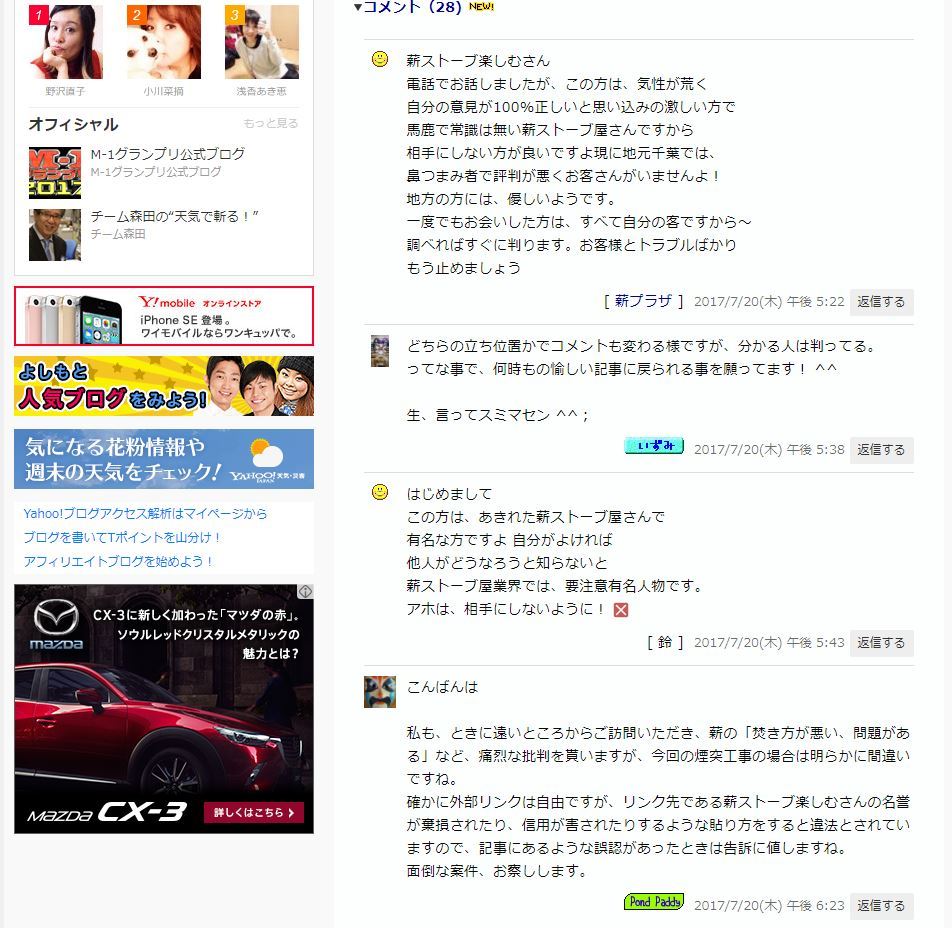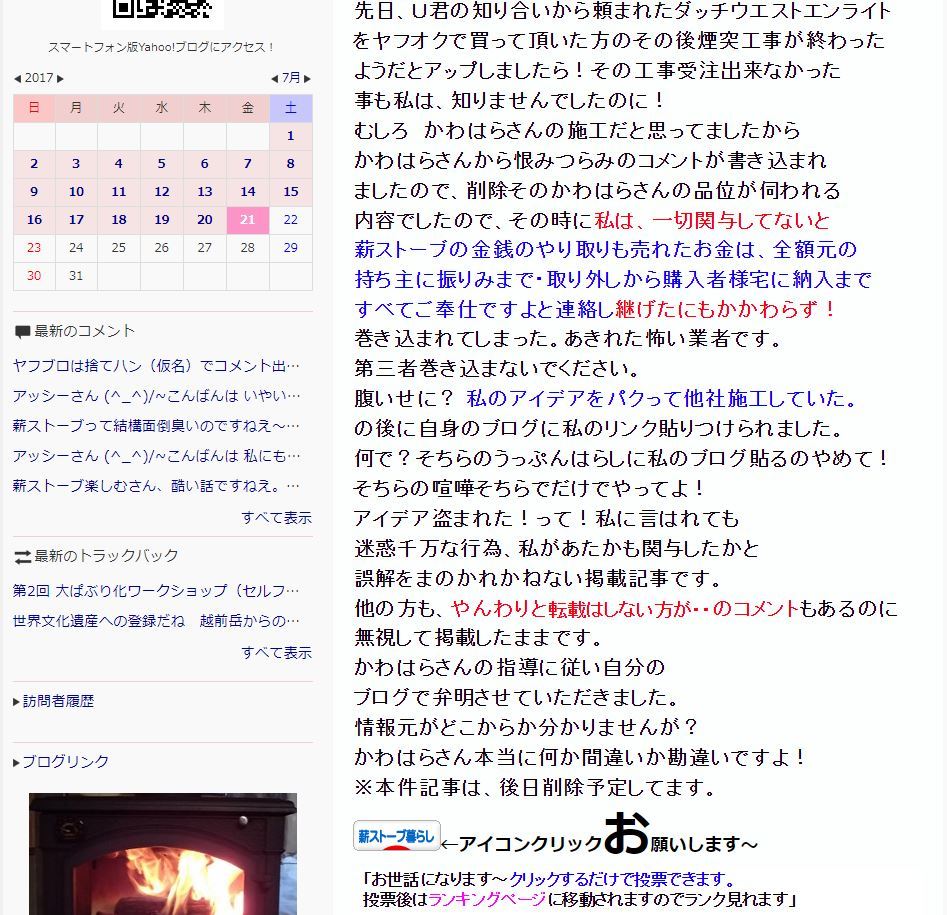 コメント欄も併せて読んでもらうと面白いが、物凄い言われようで笑える。「地元の千葉でお客様がいない」なんて、明らかに事実と違うことだ。全国対応しているから、そちらの方がインパクトがあってそう思われているのかもしれないけど、実際には地元での売上げ構成比が半分以上だ。それから別の人のコメントにあるように「薪ストーブ屋業界で要注意人物」だったら、どこから商品を仕入れるのだろう。それなりの信用と実績がないと商品は仕入れられない。まあ、自分の島を荒らされていると考える同業他社にとってはそうなのだろう・・・。さらに精神異常者とまで言われている。ここぞとばかりに【アンチかわはら派】が面白おかしく焚きつけているけど、それらは根拠のない無責任なものだというのは、冷静に考えれば理解できるだろう。あちらでコメントつけている人たちも私に文句や不満があるならば、他のブログで陰口を叩かずに直接言ってきて欲しい。