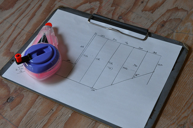 高知県での薪ストーブ設置の前に、どうしてもやっておかなければならないことがあった。お盆前後に薪ストーブ工事を行うためには、その前に炉台を完成させる必要がある。 前に現場打ち合わせした時と石の配置、割り付けが変更になったので、高知に向かう出かける道中の早朝に現場に立ち寄って、採寸して、首都高を抜けたSAで発注するというやり方で対応した。帰ってきてからだとスケジュール的にアウトだ。 早朝に現場に入らせてもらった 墨(チョークだけど)を打つ 現場の寸法と割り振りをメモ