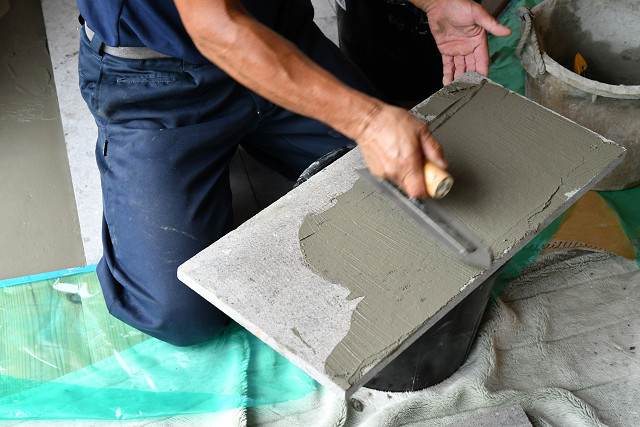 白河石での炉台工事完了 2017/8/17(9年前) 薪ストーブ 4 セメントに珪砂を入れて、今回の現場のスペシャルバージョンの薄塗りできるモルタルを作成 今回の現場はフローリングの厚みの関係で、選択した石の表面とフローリングからの段差を最低限に抑えるために、通常の砂を骨材にせずに珪砂を選択した。 モルタルを下地調整材の上に塗る 石の裏面には吸水調整材を塗布した後にモルタルを塗る 石を置いていく 完成♪ ディティールの写真はこちら