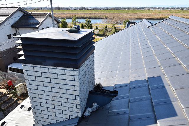 急勾配の屋根だけど、チムニーがあったので身体を預けて安全に作業できる