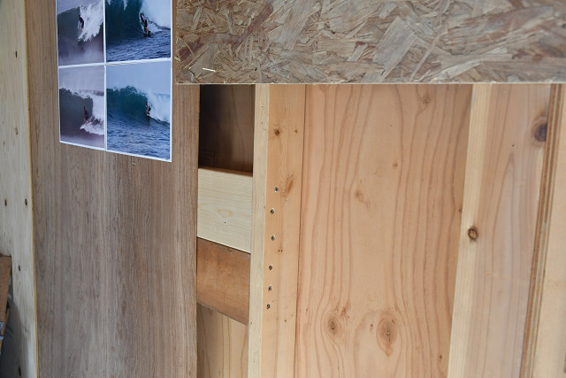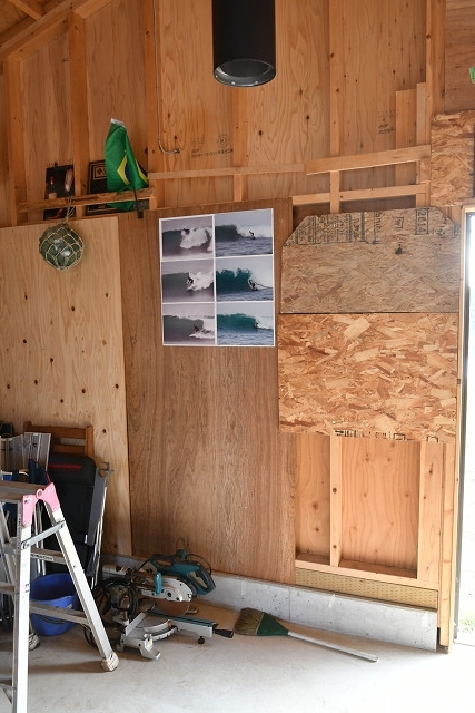 壁紙や漆喰などを塗っている既存の一般住宅の場合には予算も手間も、時間もかかる大事になってしまうけど、今回のガレージへの薪ストーブ設置は内装壁面がかなり簡易的なものだったので、一度内装壁を剥がしてから、間柱と間柱の間に煙突固定用の木下地を入れて、再び元に戻しておくことも簡単にできた。